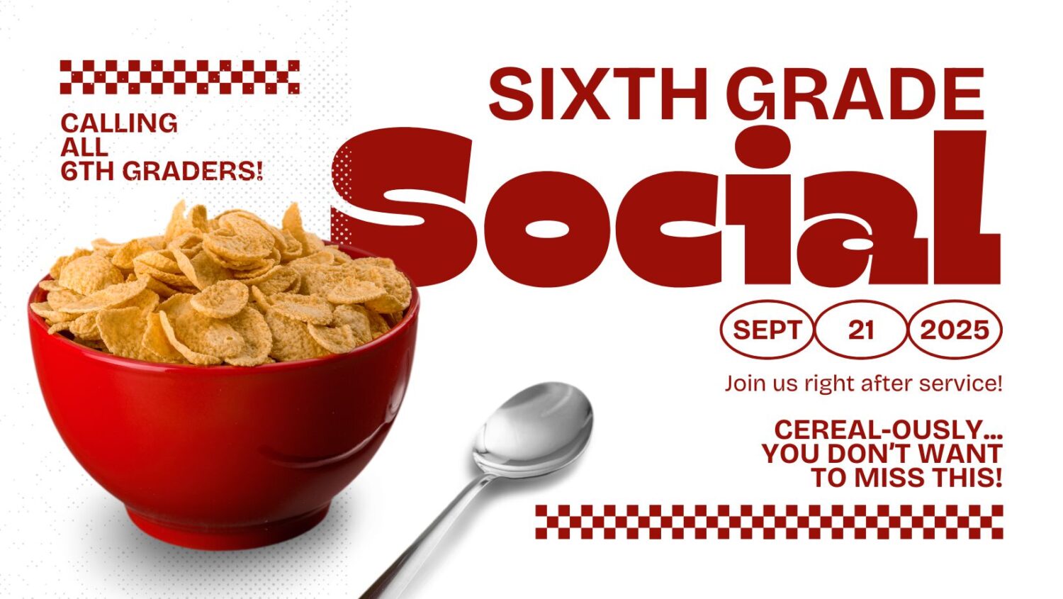 | Right after middle school service, we’re throwing a special welcome party just for our brand-new 6th graders! Join us right outside the Youth Center for a cereal bar, fun games, and a chance to meet your small group leaders! I’ll also lead them through a special tour of the Youth Center! I’m hoping this can help ease any nerves and provide a fun way to kick off their CRASH journey as they start building connections that’ll carry through the year. We can’t wait to see your student there!